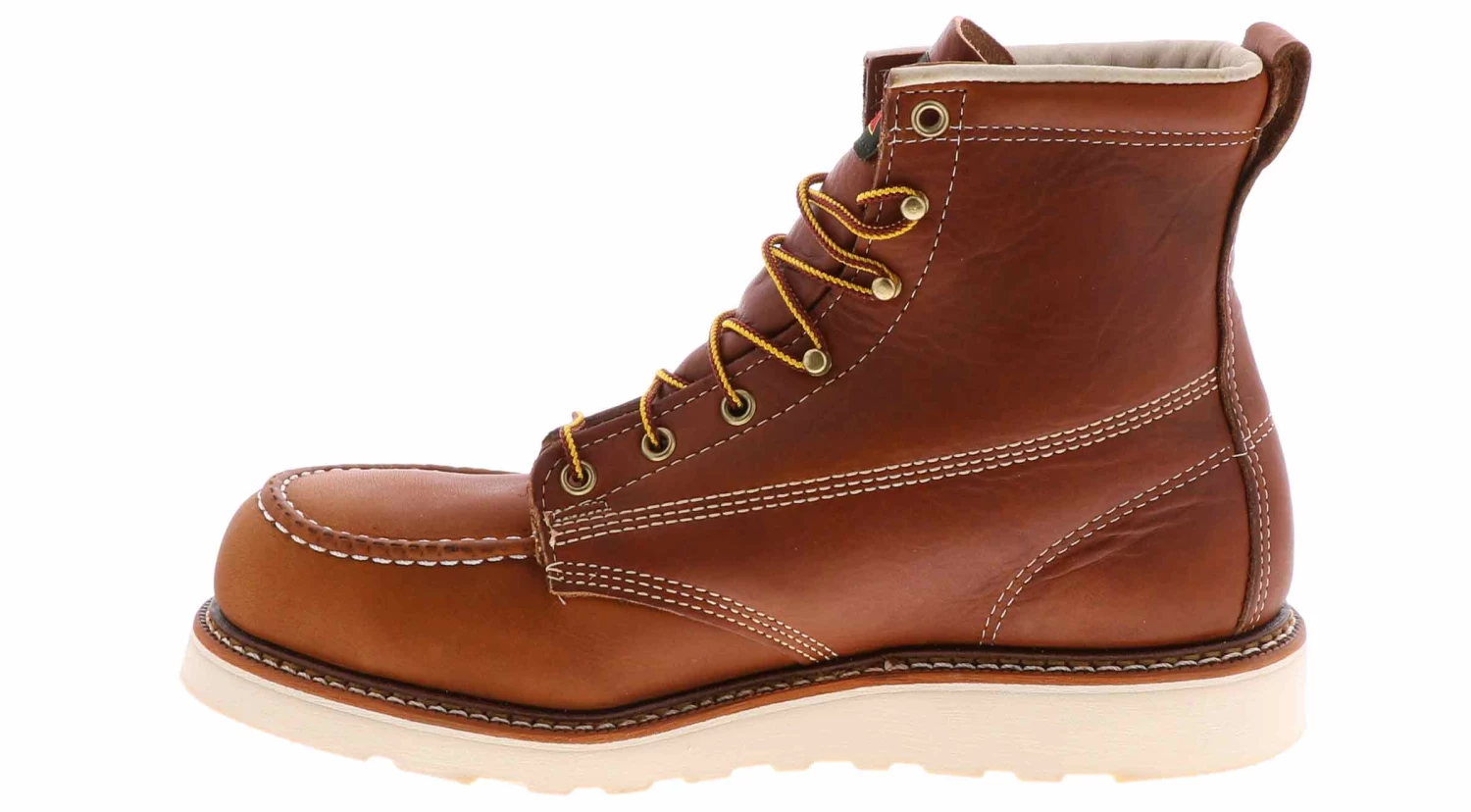 Stay safe and comfortable in the Thorogood American Heritage Safety-Toe Work Boot. This style features a 6-inch shaft and is made of Tobacco oil-tanned leather. These moc toe boots are breathable, and the MAXWear Wedge outsole keeps you from slipping. The steel toe protection will keep your foot safe as you work all day.